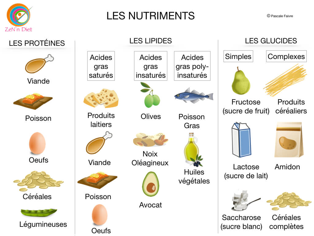 Notre corps est tout d’abord constitué de cellules. Chacune d’entre elles nait, se nourrit et se régénère grâce aux nutriments. Ces nutriments sont les proteines, les lipides et les glucides. Voici un tableau qui présente les différentes catégories de nutriments :