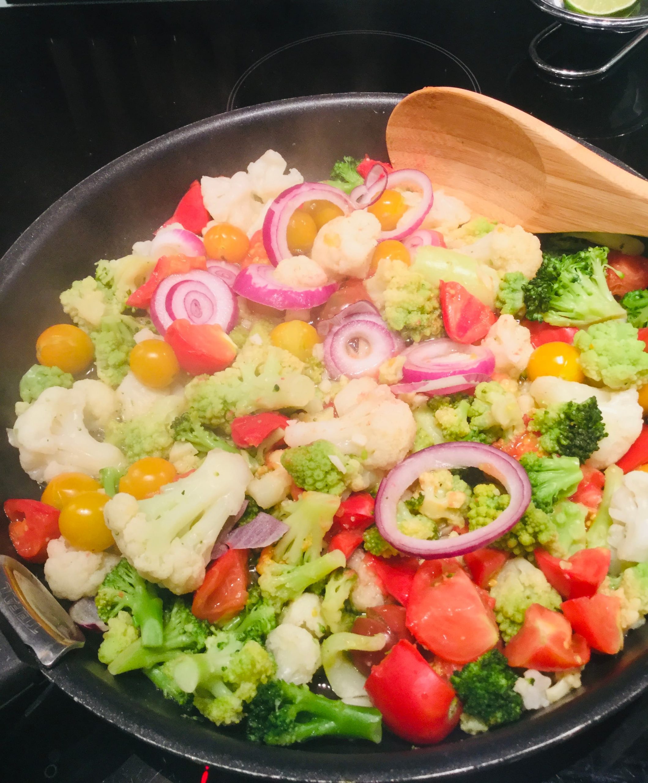 - Faire revenir dans une poêle (en céramique de préférence), les légumes, l'oignon et l'ail, à feux doux.